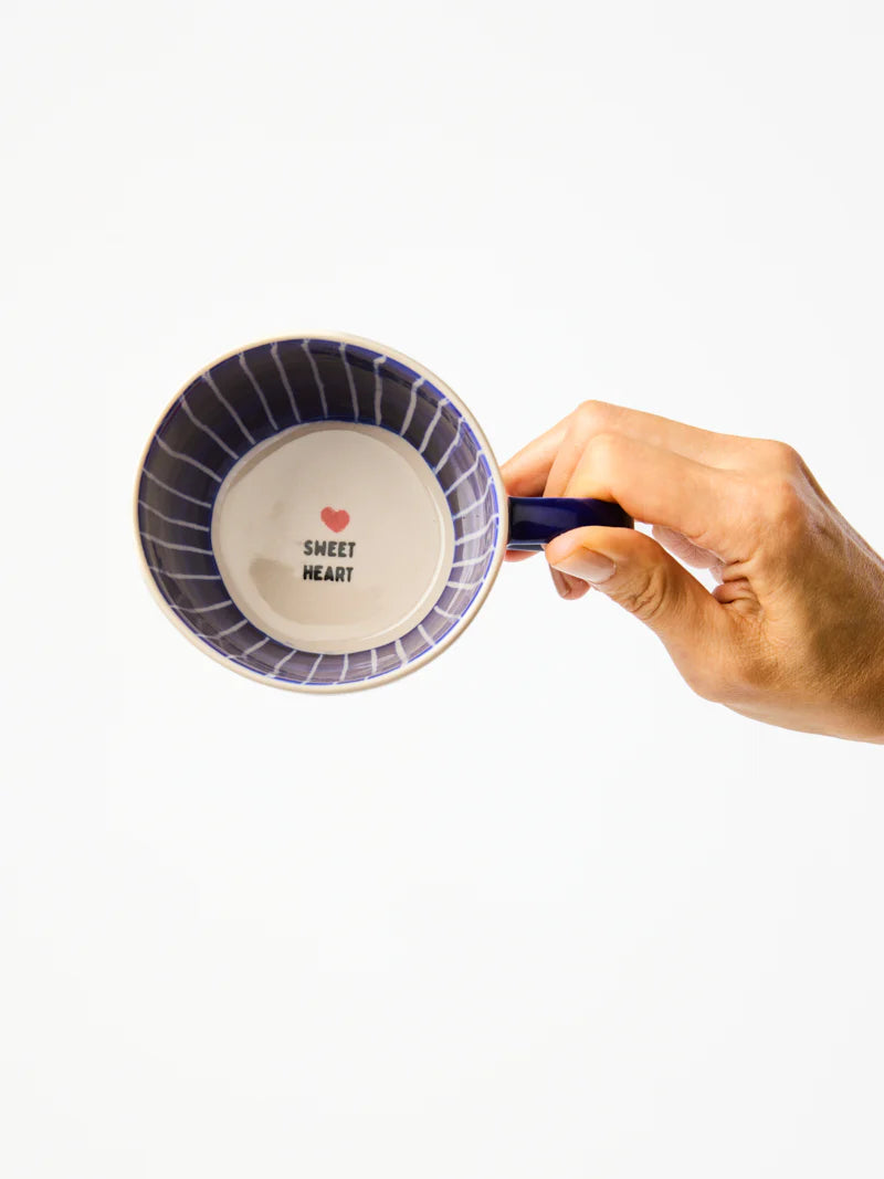 A hidden "Sweet Heart" message awaits at the bottom of the indigo-striped interior of this Chino mug, offering a moment of unexpected joy with your final sip. The exterior is dotted with hand painted red love hearts, creating a sweet pattern. Each piece is shaped from durable earthenware by skilled Vietnamese craftspeople working from our Sydney designs, the deep blue stripes and hearts applied by hand with practiced precision.