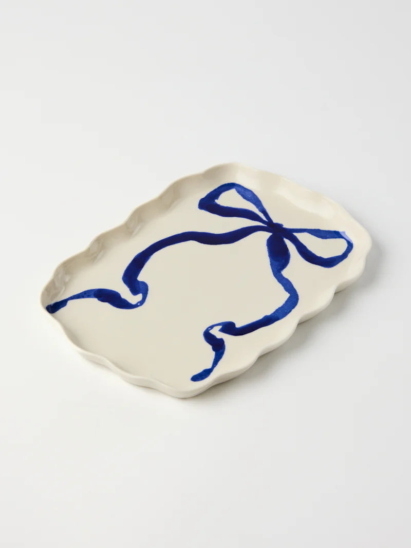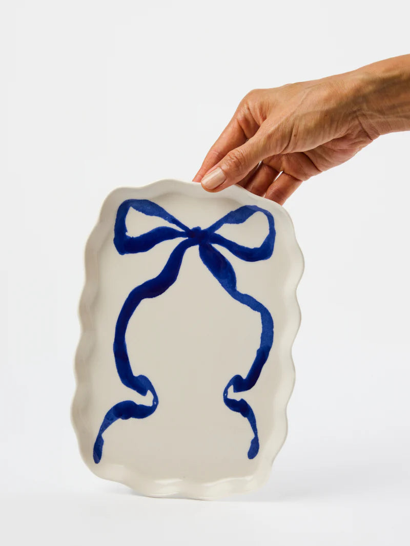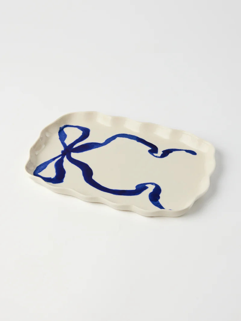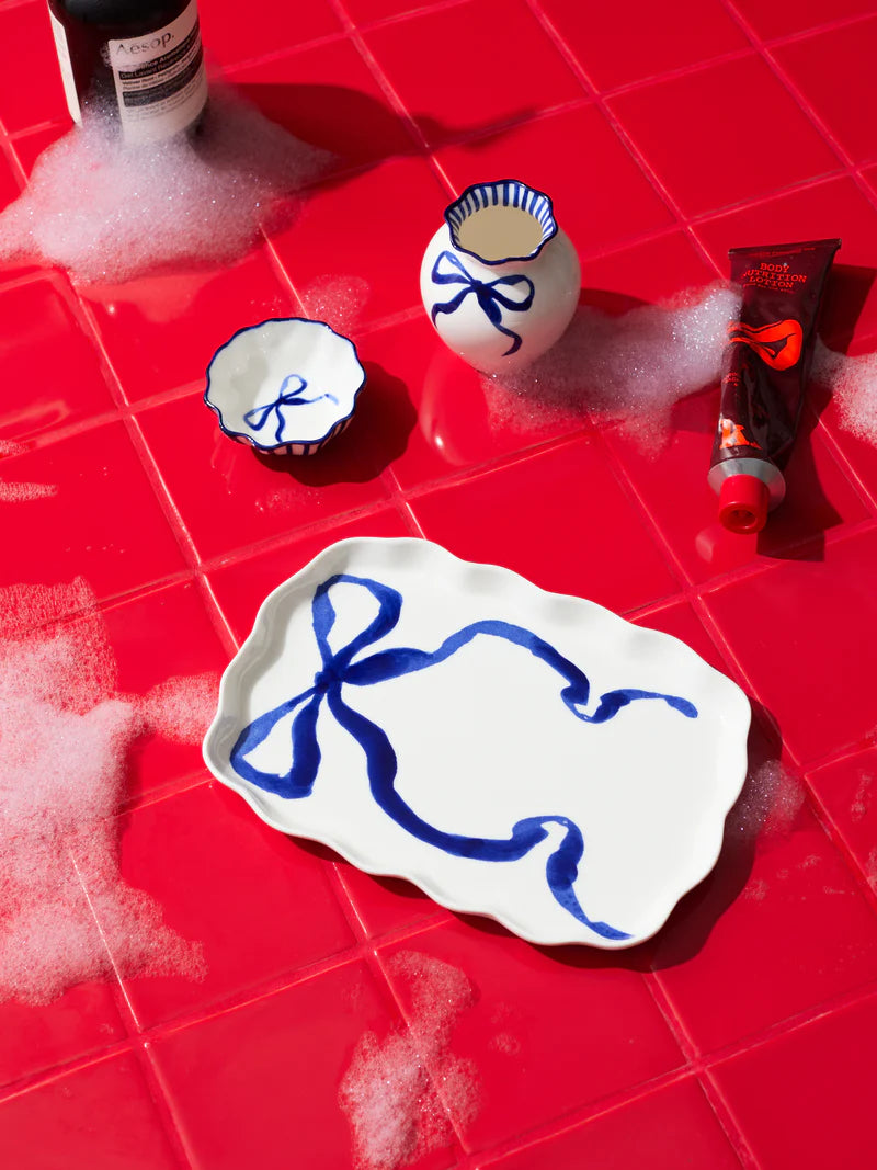 Flowing indigo ribbons stretch across this undulating earthenware tray, each brushstroke applied by hand with meditative care. The Margot Tray, conceived in our Sydney studio and crafted by skilled Vietnamese artisans, offers an elegant stage for bathroom essentials or bedside treasures transforming everyday organisation into a reverent ritual.