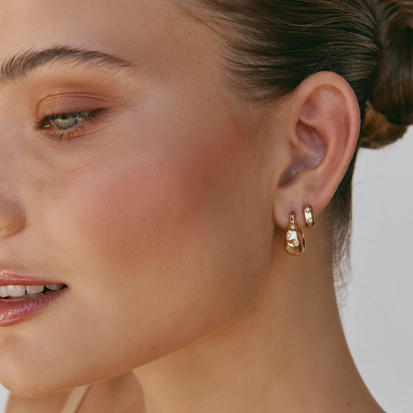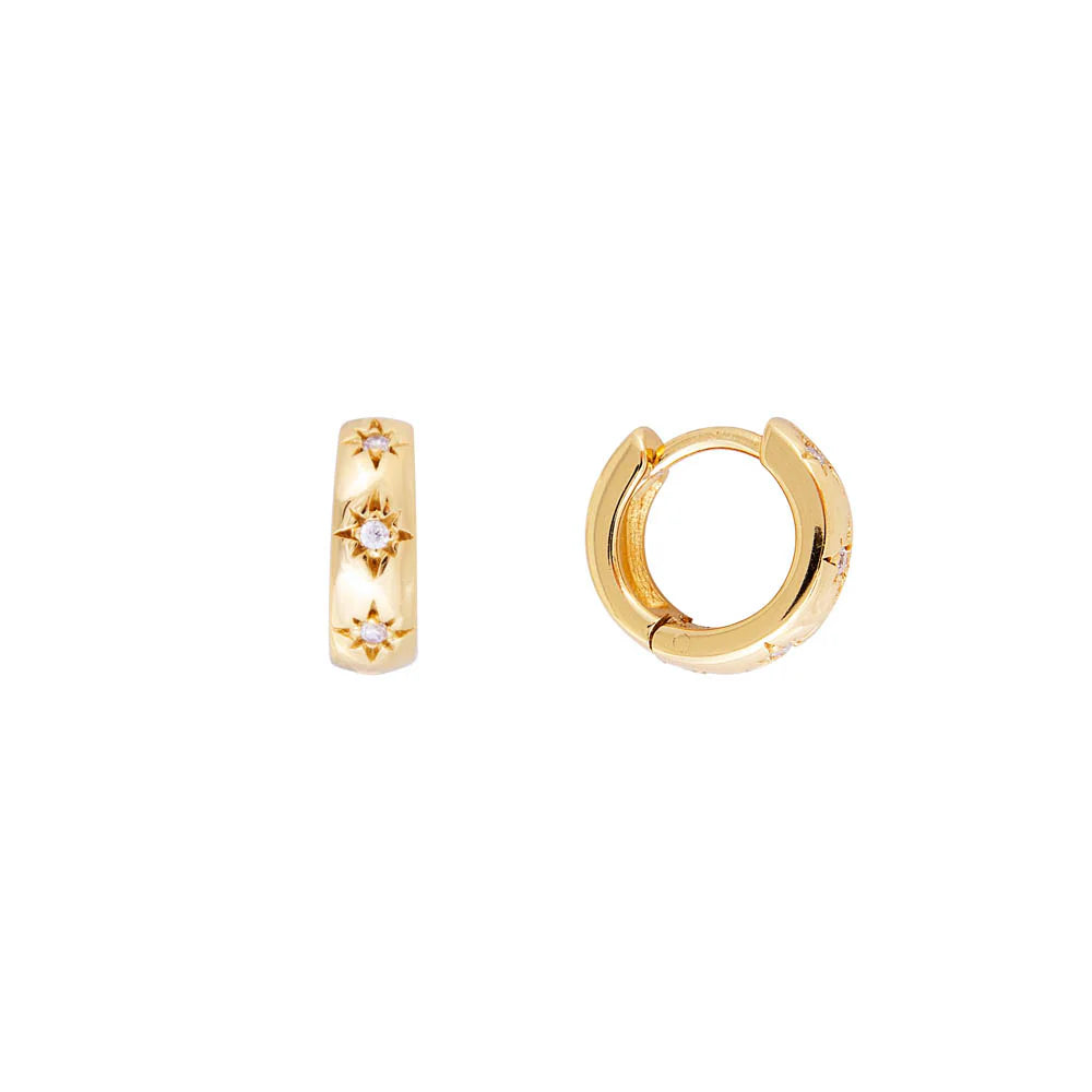 Add a touch of celestial charm to your everyday look with the Starburst Huggies. These dainty yet striking earrings feature a radiant starburst charm, symbolizing brilliance and new beginnings. Crafted in 18k gold-plated sterling silver, the huggie hoops are designed to sit snugly on the ear, offering both comfort and elegance.